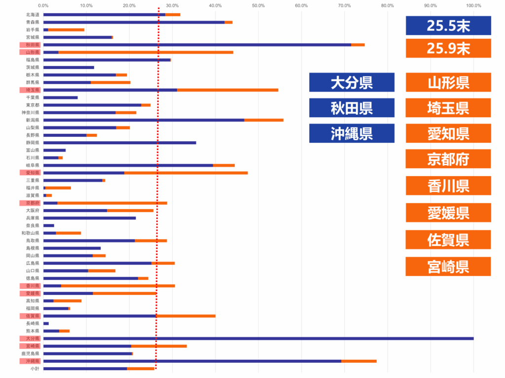 広島県は8月1日に協会員宛にに宣言提出を促す文書を発信しております。恐らくほとんどがそのタイミングかと思われますが、下のグラフの青い部分が5月末時点、オレンジの部分が9月末時点ですから、「これはマズいぞ!」と頑張ったのがオレンジが大きく伸びている都道府県ということになります。増加率で言いますと、