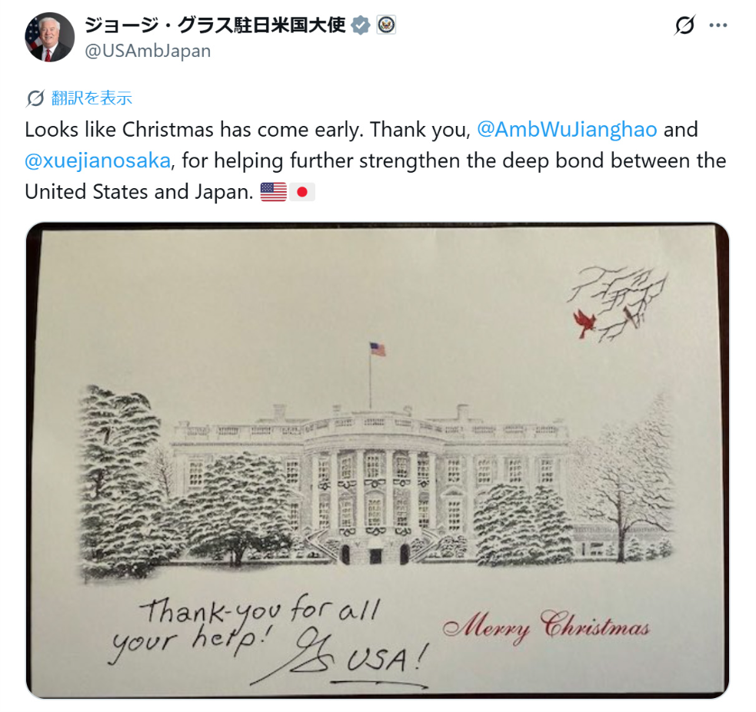 一方、それとは全く対照的に、日本にエールを送ってくれた人がいました。ジョージ・グラス駐日米国大使です。「汚い首は斬ってやる」等と非常識投稿をした中国の薛剣(せつけん)駐大阪総領事と駐日中国大使に対して、Xで痛烈というか痛快な皮肉メッセージを送ったのです。