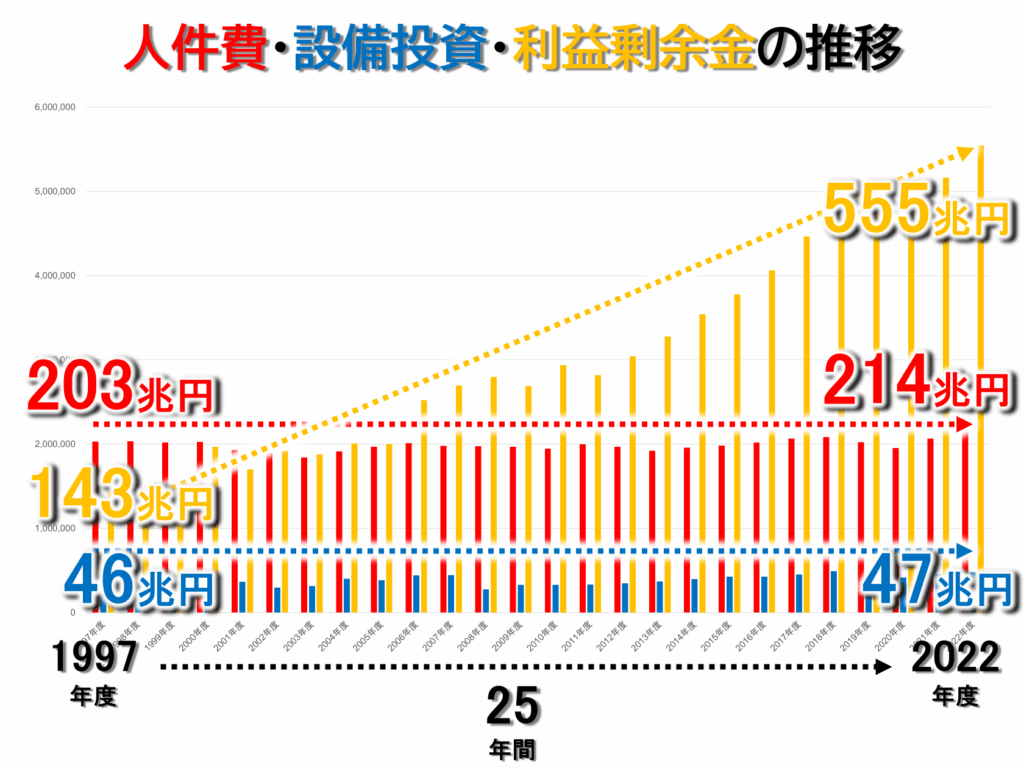 設備投資も抑えられ、給与も騰がらず、曲がりなりにも黒字を出してきた企業が稼いできたお金は全て内部留保として蓄えられていきました。